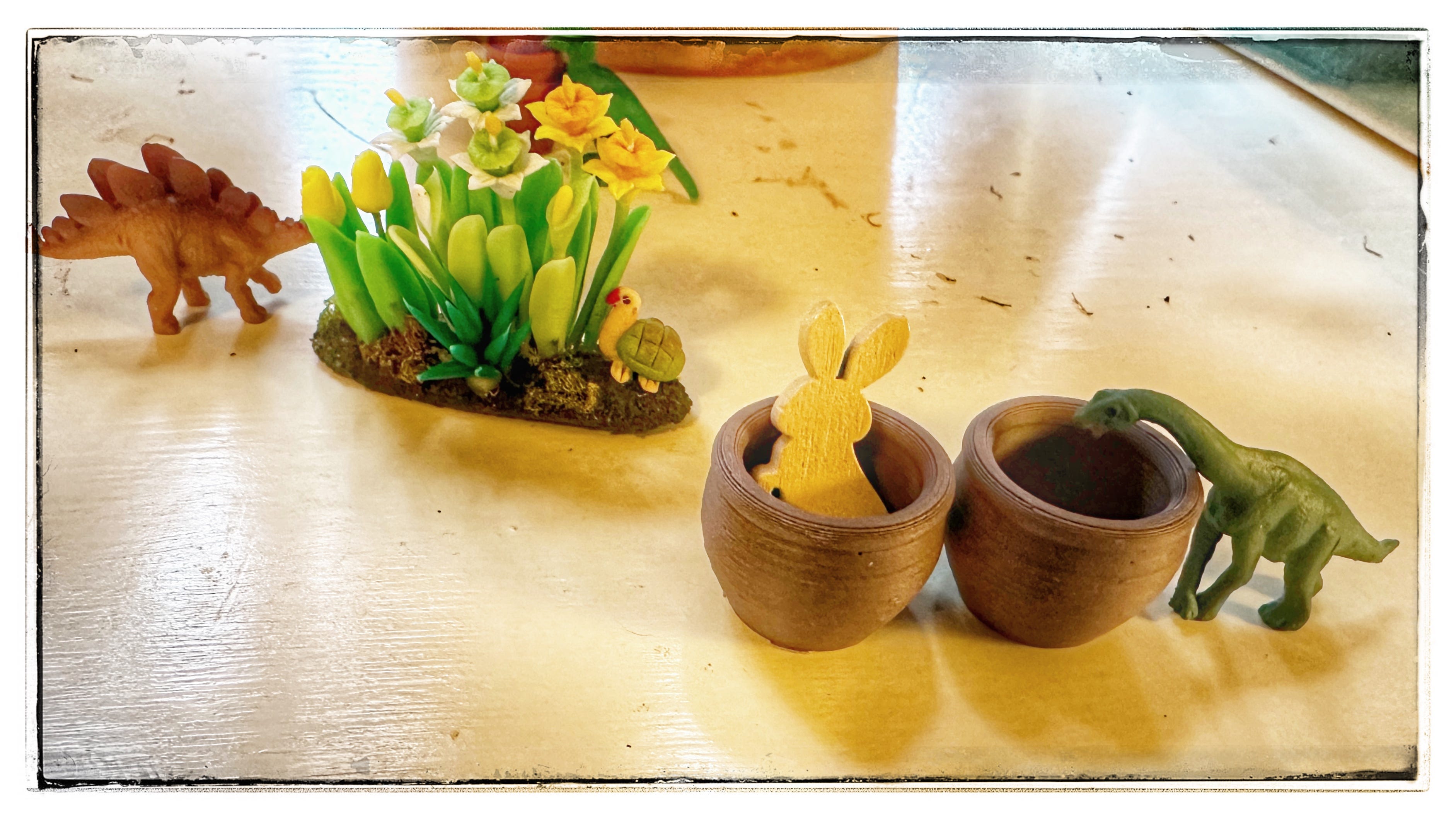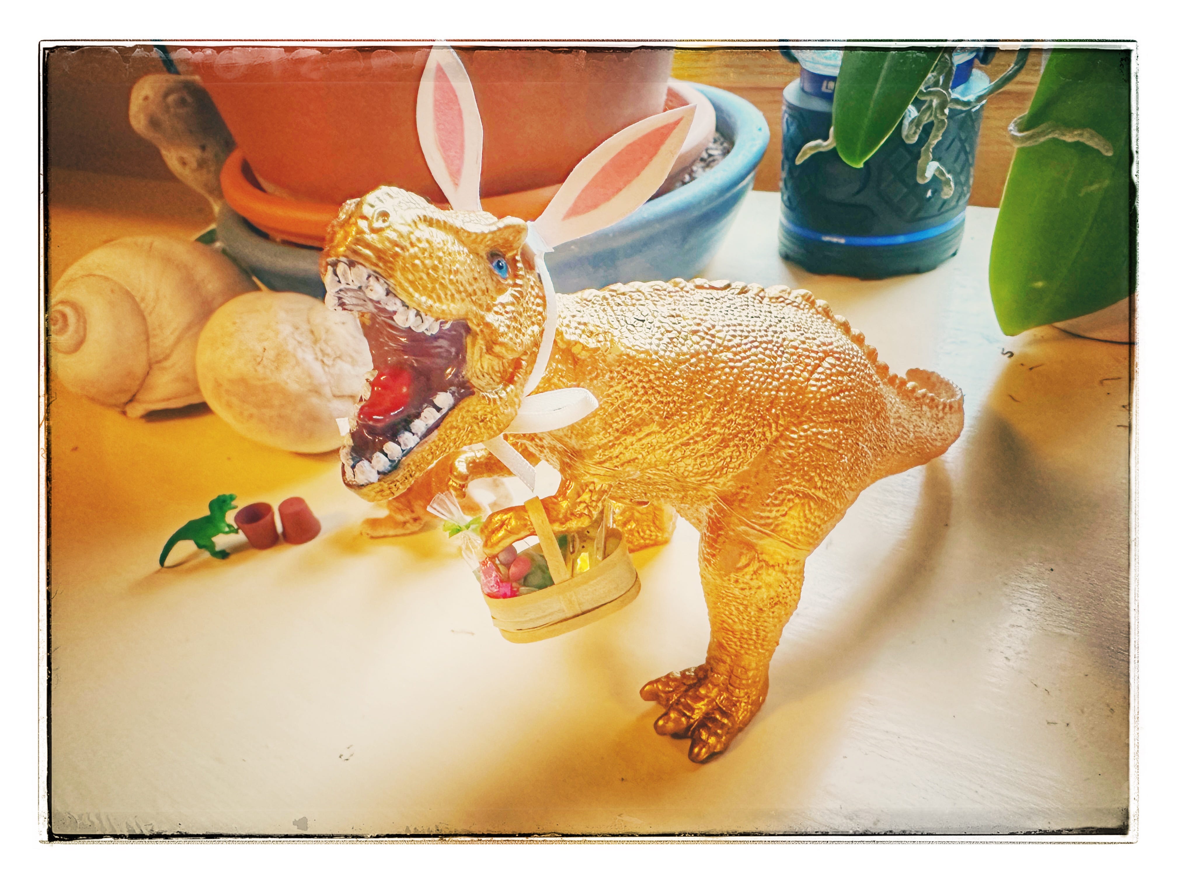 Today it is a T-Rex going to an Easter egg hunt with other dinos.